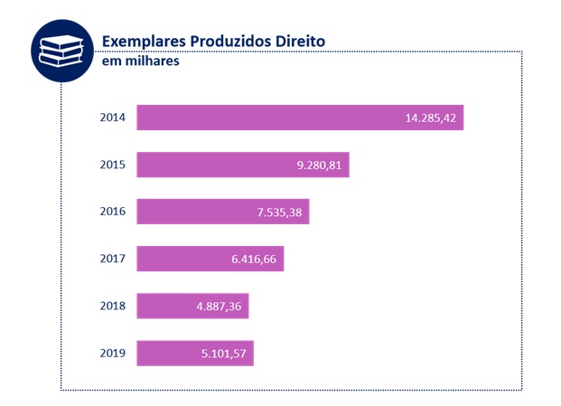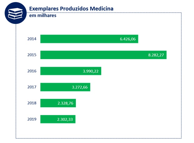 E aqui cabe um contraponto interessante: quando se compara esses dados com a produção de livros físicos focada nessas duas categorias, há uma inversão. De 2014 a 2019 o mercado editorial enxugou em 64% o número de exemplares produzidos de direito e medicina, segundo a pesquisa Produção e Vendas do Setor Editorial Brasileiro. A pesquisa não possui dados acerca das vendas efetivamente realizadas dessas categorias, mas é difícil imaginar que essa redução não esteja acompanhada de uma redução nas vendas desses livros, afinal não faz sentido as editoras não reduzirem expressivamente a produção de livros que permanecem com o mesmo volume de vendas, de modo que consideramos válido considerar que a redução da produção de exemplares consumidos está diretamente relacionado à queda de vendas das obras para o público deste segmento.