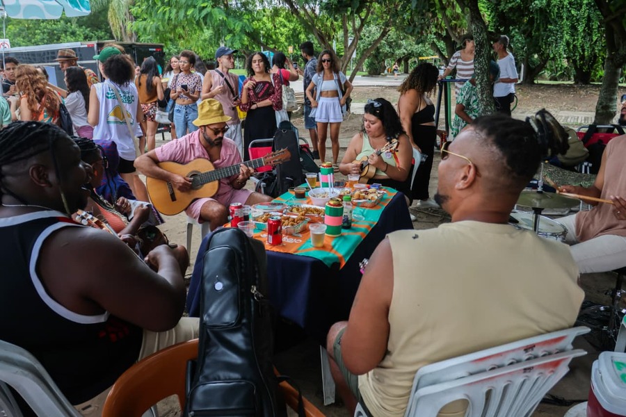 Encerrando o encontro, uma roda de samba sob as árvores integrou música e literatura em uma mesma experiência cultural. Entre pandeiro, tantã e violão, livros e ideias continuaram a circular, reafirmando a cultura como expressão viva e integrada.