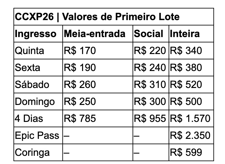 A edição de 2026 da CCXP abrirá as vendas para o público geral em 10 de junho, a partir das 12 horas, exclusivamente pela Mundo Ticket, bilheteria oficial do grupo Omelete Company. Um dia antes (09), o público que garantiu o Epic Pass no ano passado tem o benefício de acesso antecipado às vendas para a edição deste ano, das 10h às 23h59. Além do Epic Pass, o público poderá escolher entre ingressos diários, para quatro dias, ingresso Coringa — uma novidade que permite definir a data de visita mais próxima ao evento —, Unlock Business e Unlock + CCXP. A CCXP 2026 ocorre entre 3 e 6 de dezembro, no São Paulo Expo, em São Paulo (SP).